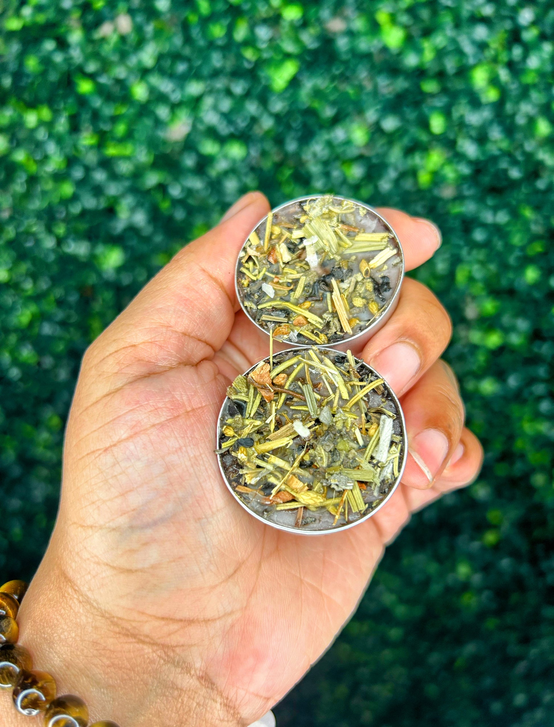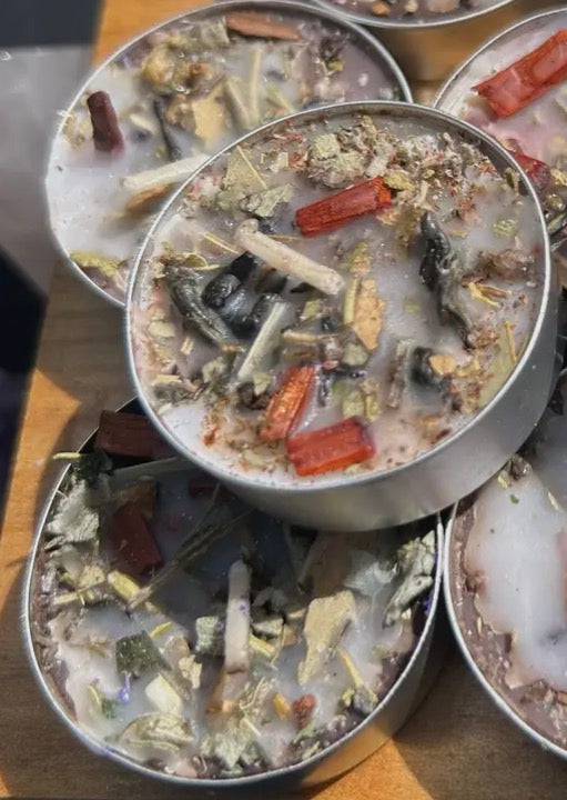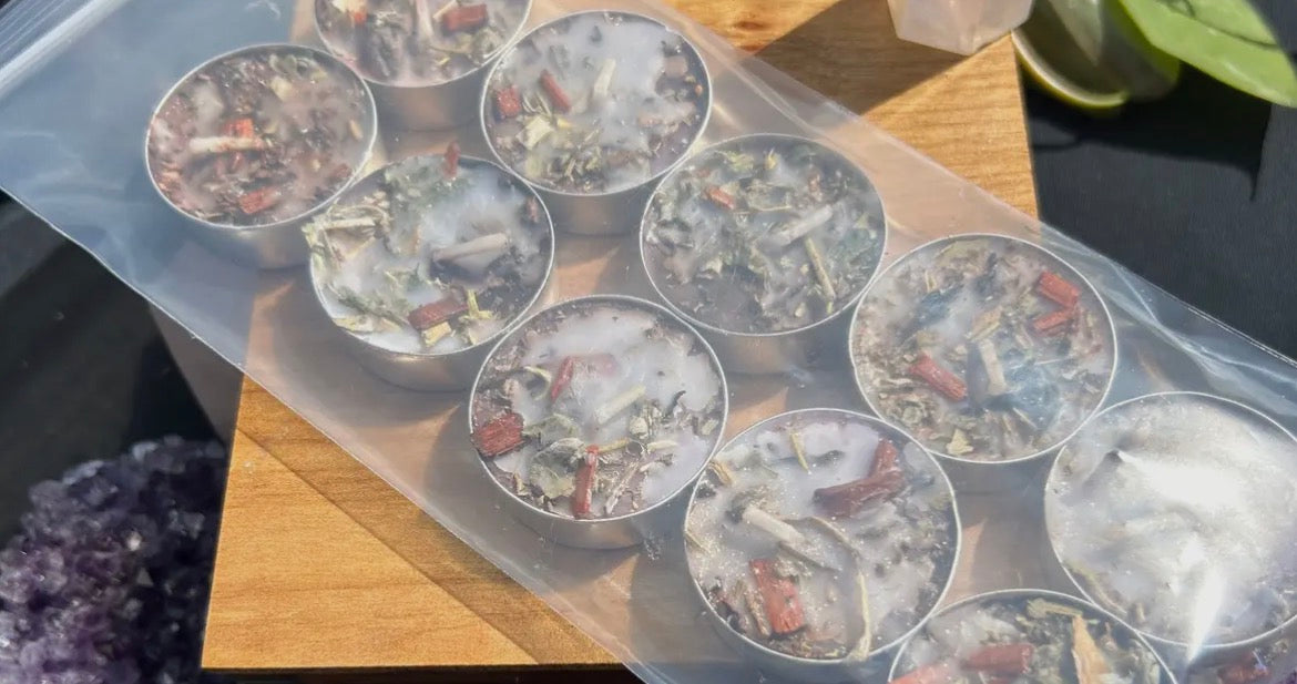 Our Divine Protection Candles are hand dressed with herbs, flowers, and anointing oils to anchor your energy in peace and protection. Each tea light carries a warm Spiced Nuts scent.