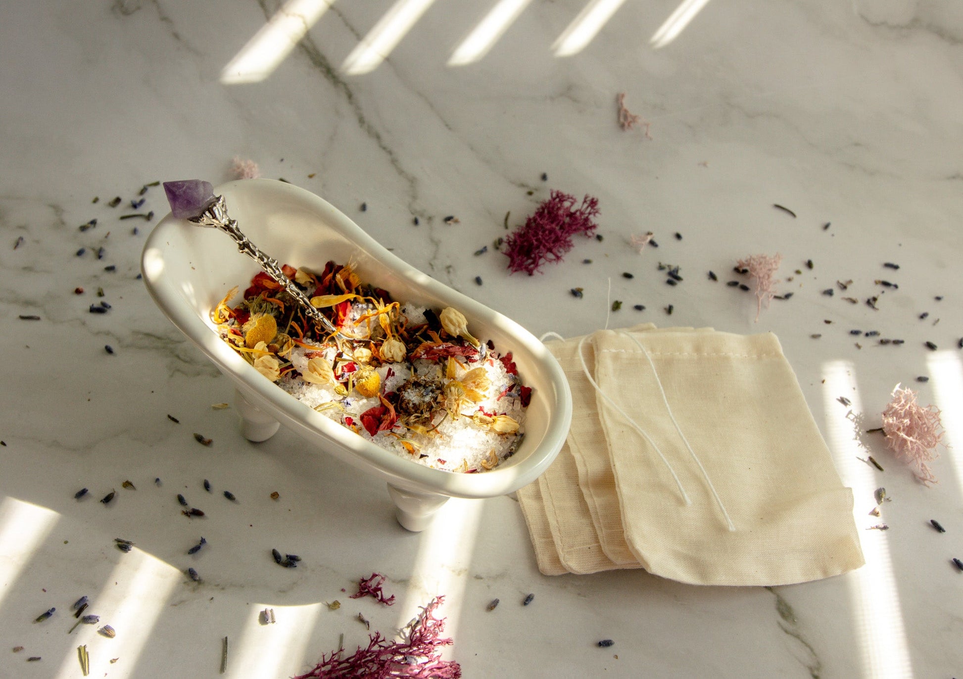 - Deluxe Ritual Kit – Includes a refill sized bag of our herbal bath tea, four reusable muslin tea bags, and a unique antique style tea spoon adorned with a crystal perfect for an elevated bath ritual experience.